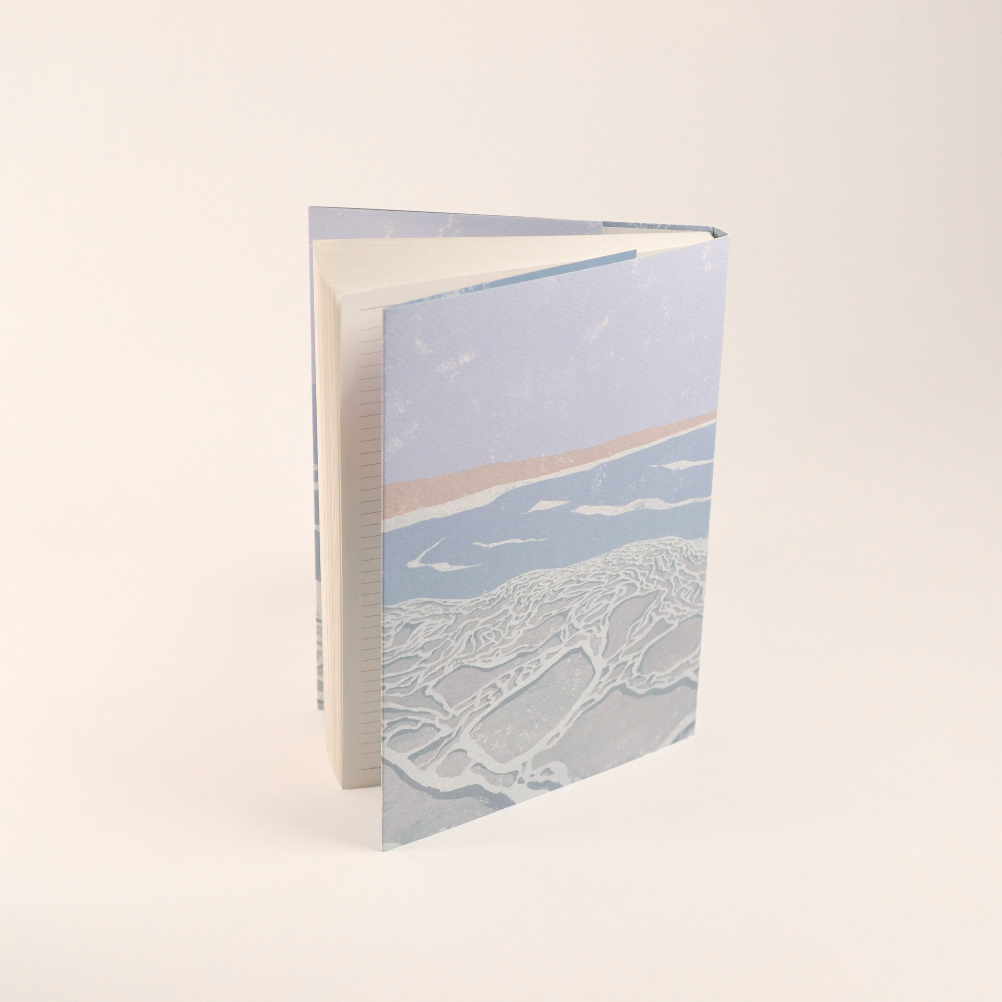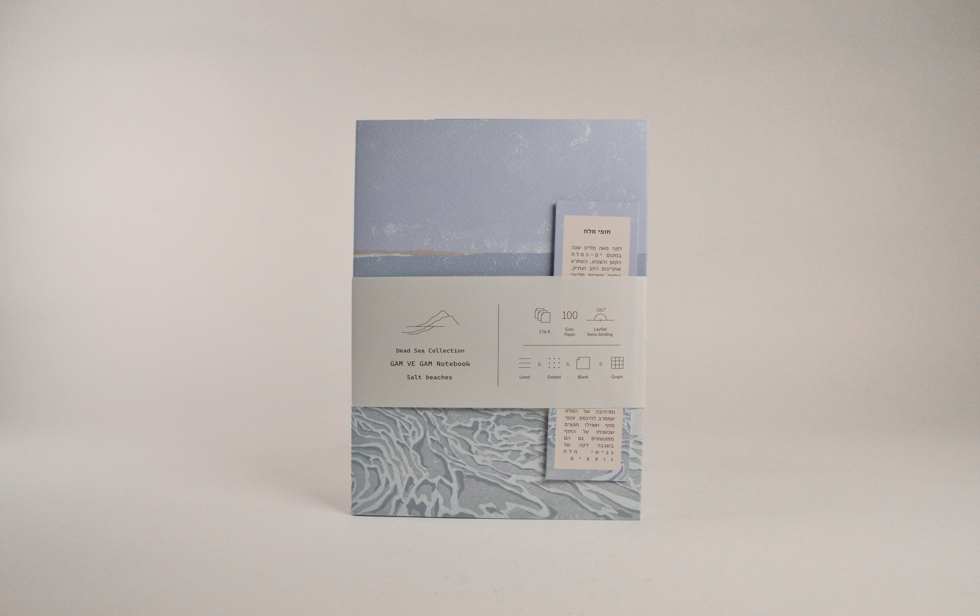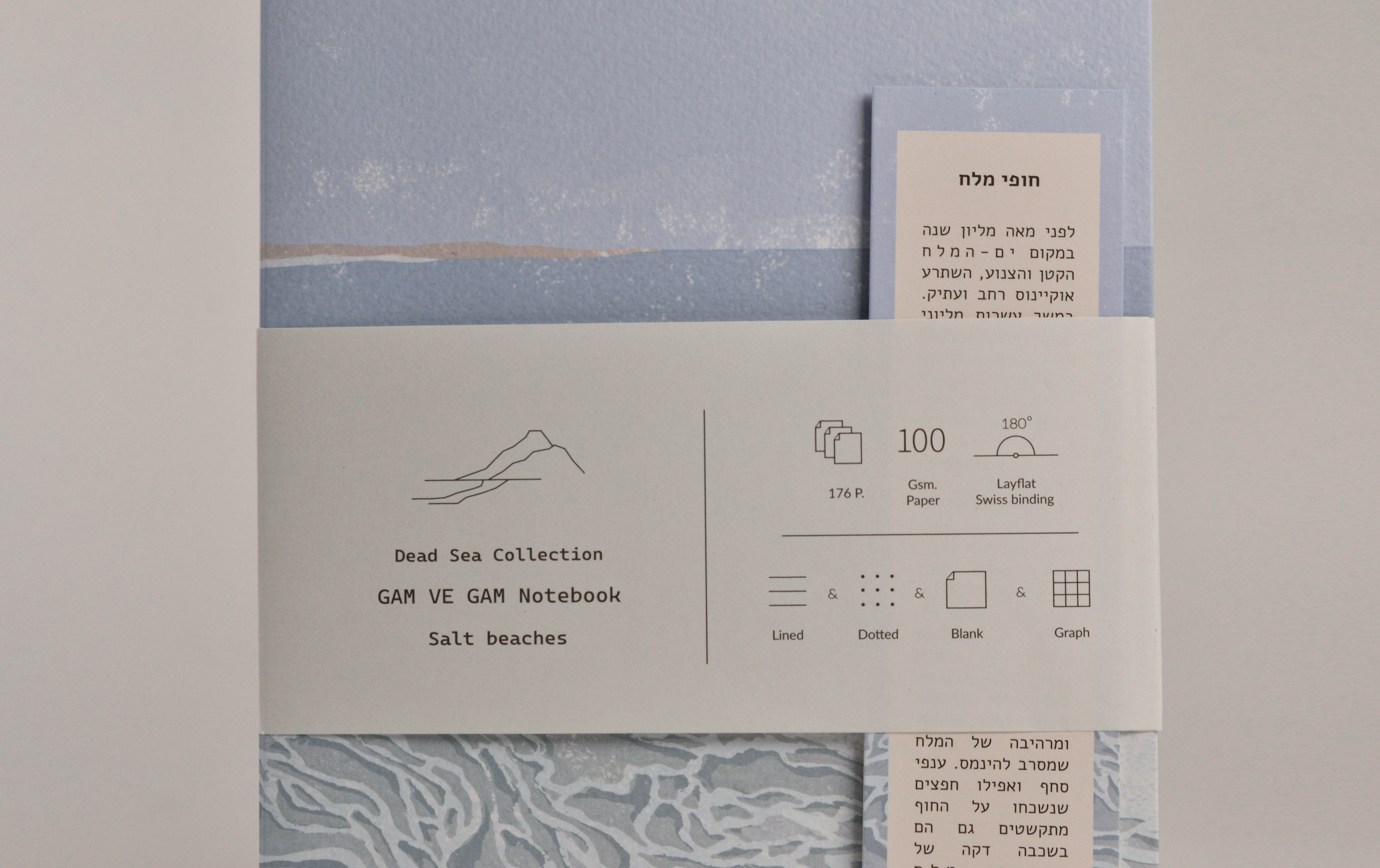 The illustration on the cover is inspired by the sparkling salt shores of the Dead Sea. The notebook includes a bookmark providing a short insight into how these unique shores are formed (written in Hebrew).